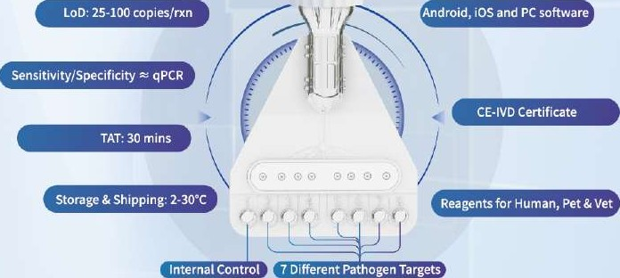 designed for human and animal diagnostics. It integrates three core technologies into a single solution: microfluidic chips, fluorescence detection, and LAMP (Loop-mediated isothermal amplification).